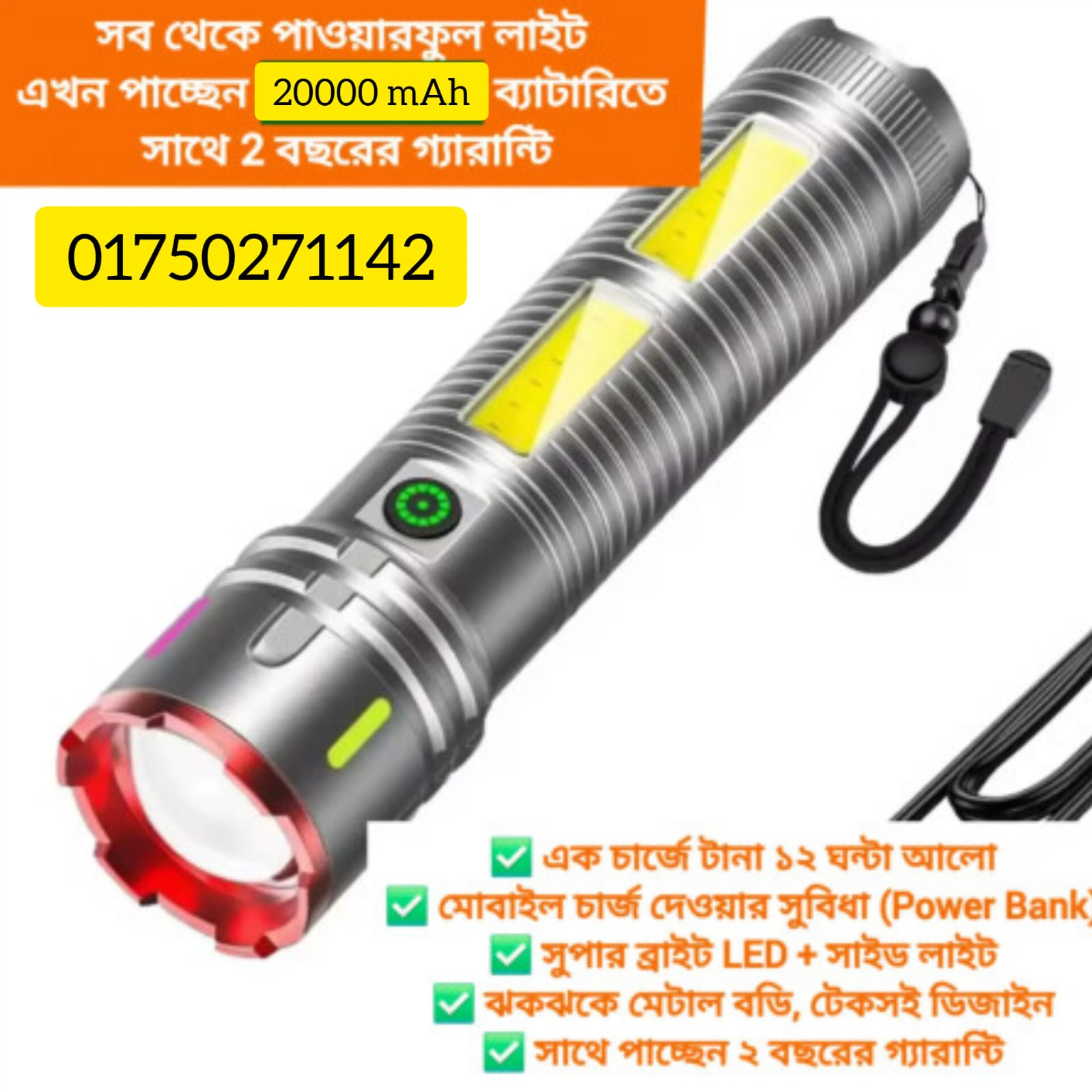 সুপার সিলভার টর্চ লাইট উইথ পাওয়ার ব্যাংক, সাইড ল্যাম্প লাইট, চার্জ ডিসপ্লে